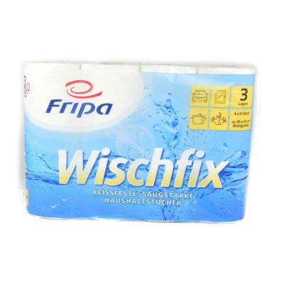 Ręcznik papierowy idealnie nadaje się do wycierania czy też sprzątania w kuchni, pokoju. Komplet 4 szt. rolek, ręczniki kuchenne są 3-warstwowe, 26 cm x 24 cm, kolor: biały, \"Wischfix\", 51 listków