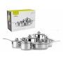 Garnki wykonane zostały ze stali nierdzewnej chromowo - niklowej 18/10, co gwarantuje trwałość materiału. Uchwyty naczyń do gotowania też są wykonane ze stali nierdzewnej. Pokrywka jest wykonana ze szkła żaroodpornego. Garnki posiadają termoakumulacyjne, 3 warstwowe dno o grubości 5mm - ułatwia to szybkie nagrzewanie oraz równomierne rozprowadzanie i długotrwałe utrzymanie ciepła.