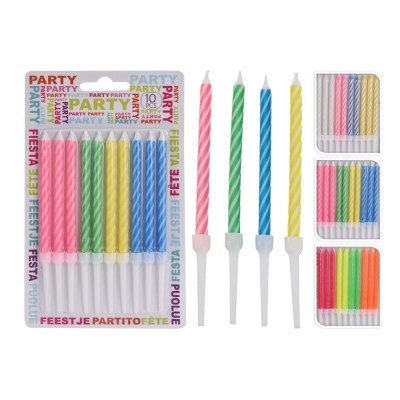 Świeczki urodzinowe to nieodłączny element każdego przyjęcia urodzinowego. Zestaw składający się z 10 świeczekz podstawkami do umieszczenia w torcie.